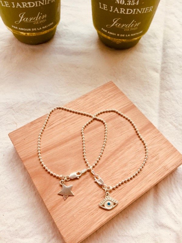 Pulsera Bolitas con Dije. Plata 925. Medida total 19 cm. (con ojito incluido).