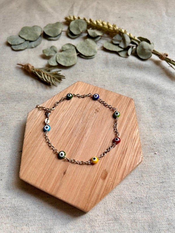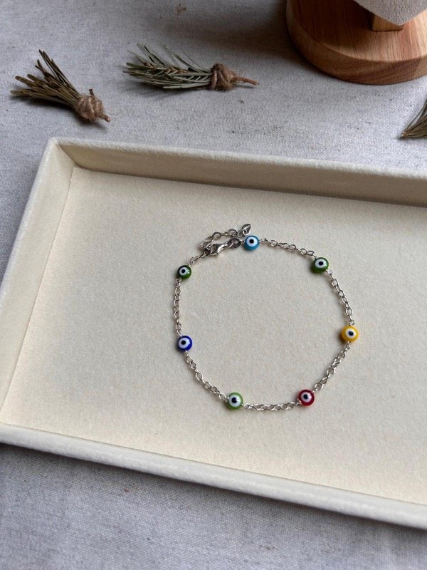 Tobillera Ojos Multicolor, Plata 925. Medida total 26 cm (con extensión incluida).